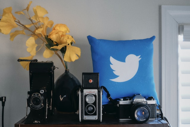 Uma imagem de um travesseiro com o tema do Twitter em uma mesa ao lado de um equipamento de gravação de vídeo.