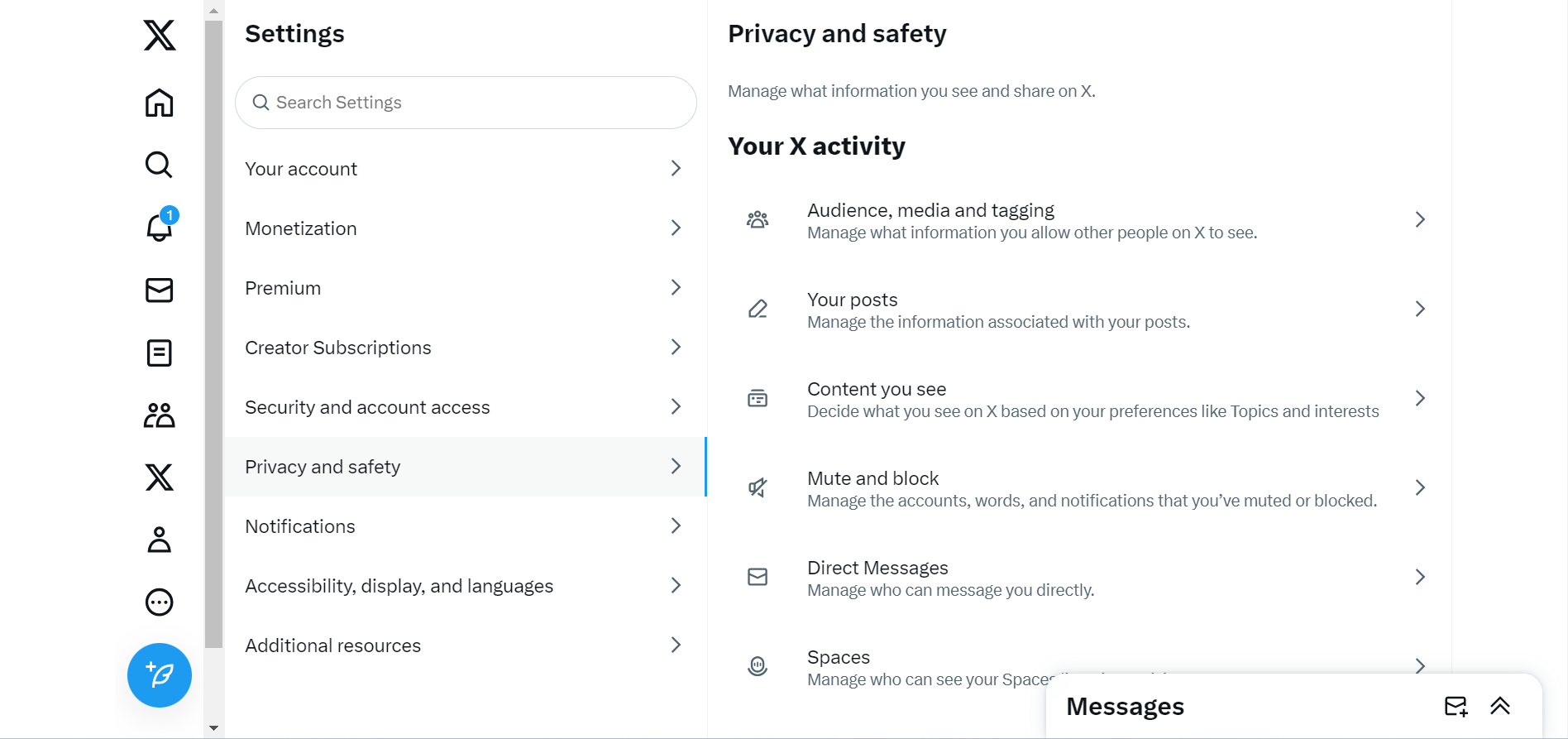 - Escolha "Privacidade e segurança", a terceira opção no menu para acessar suas configurações de privacidade do X.