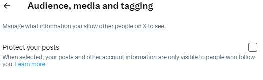 2. Texto alternativo: Captura de tela do TweetEraser das configurações de privacidade e segurança do X, mostrando a opção Público, mídia e marcação .Marque a caixa de seleção com a solicitação para Proteger suas publicações. Isso desativa o recurso de tweets protegidos, permitindo que todos vejam seus tweets.