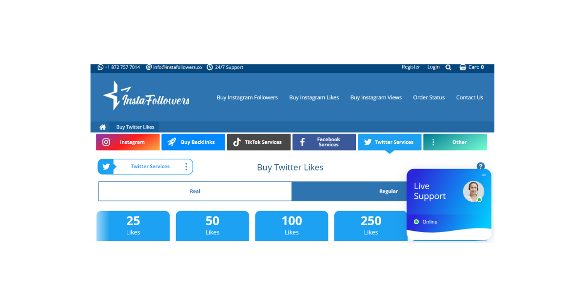 InstaFollowers ist einer der besten Orte, um Likes für Ihre Twitter- oder X-Posts zu kaufen. Sie bieten erschwingliche Dienste an, damit Sie mit Ihrem Budget wachsen können. Für 0,88 $ können Sie bis zu 25 Likes von echten Menschen kaufen. Es gibt auch andere Pakete von 50 bis 500 Likes. Gleichzeitig können Sie für spezielle Pakete bis zu 10.000 Likes bestellen.
