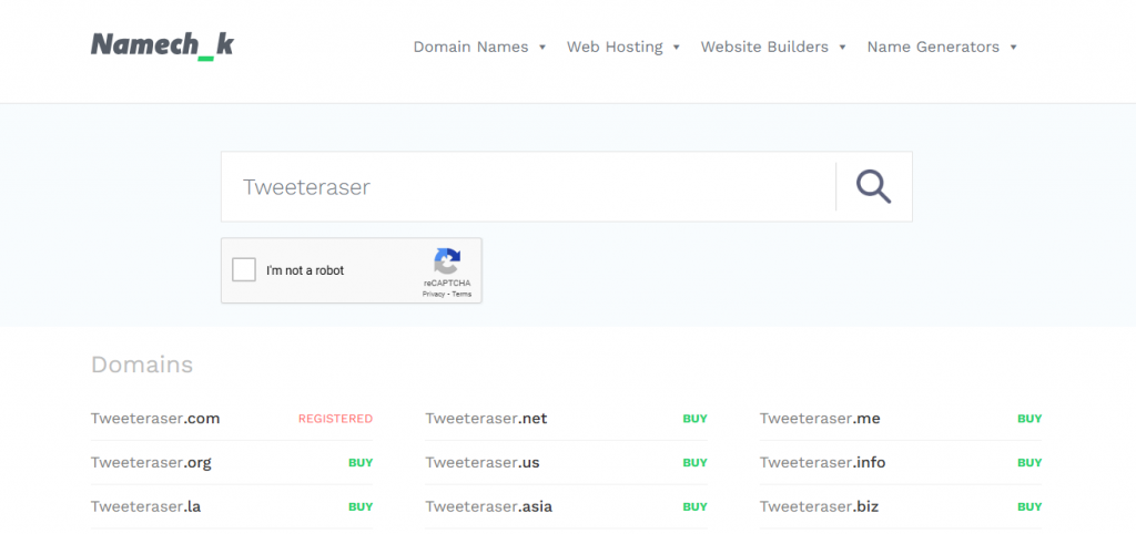 Captura de pantalla de TweetEraser confirmando que el nombre de usuario de TweetEraser no está disponible usando Namechk en un escritorio.