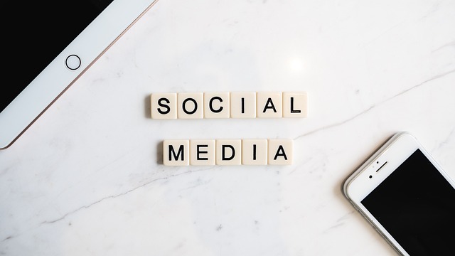 Fichas de Scrabble entre un smartphone y una tableta que deletrean "Social Media" sobre una superficie blanca.