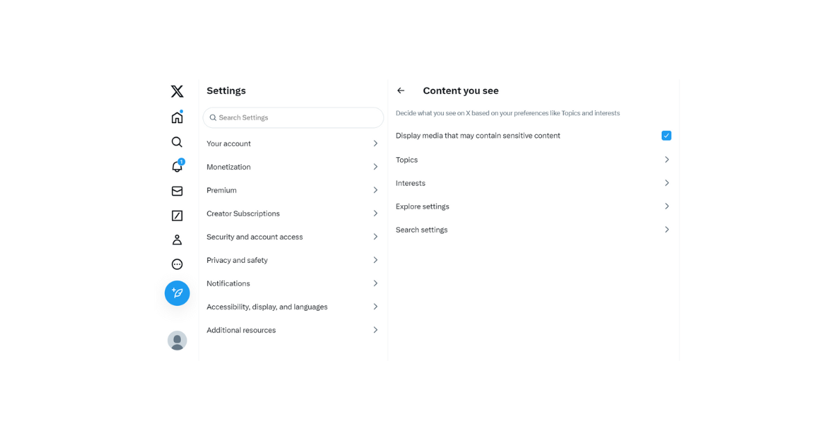 Anda dapat menemukan topik baru dan mengikuti topik tertentu dari pengaturan Twitter Anda. Pengaturan Konten X Anda berisi menu yang berisi daftar topik yang Anda ikuti. Di bawah daftar ini, Anda akan menemukan topik lain yang dapat Anda ikuti.