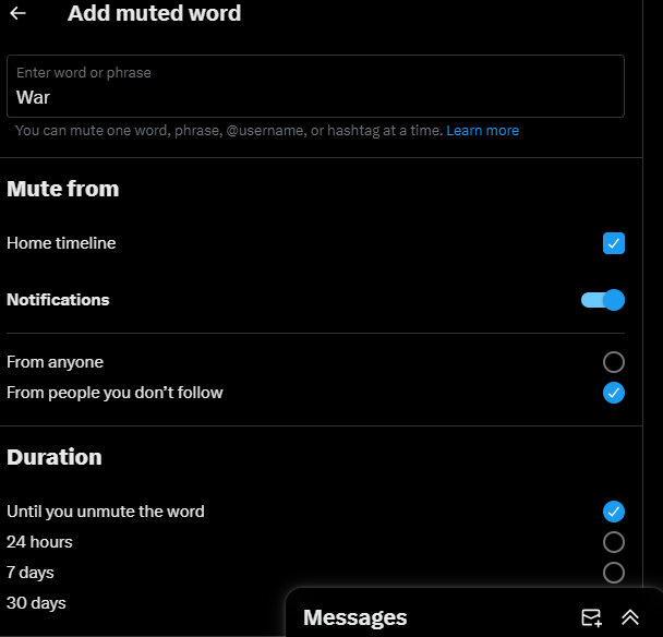 - Masukkan kata, frasa, hashtag, atau nama pengguna Twitter yang ingin Anda bisukan di ruang di bagian atas.