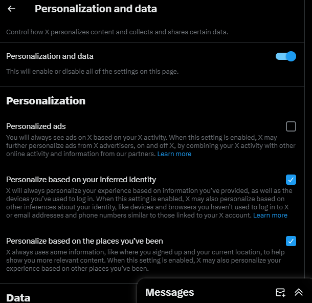 Twitter, alias X, mengawasi data, lokasi, riwayat penelusuran, dan aktivitas lainnya dari para penggunanya. Platform ini menggunakan informasi ini untuk menyediakan umpan yang lebih personal. Informasi ini juga berguna untuk menentukan postingan yang disarankan. Oleh karena itu, menyesuaikan pengaturan personalisasi dan data akan membantu menonaktifkan saran pada akun Anda.