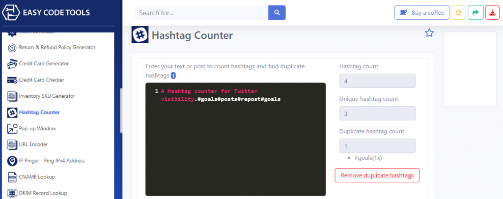 Easy Code Tools este un site de codare ușor de navigat, care oferă instrumente valoroase pentru toată lumea. Instrumentul său gratuit de numărare a hashtag-urilor este una dintre numeroasele sale caracteristici care oferă rezultate instantanee. Acest instrument detectează câte etichete sunt într-o postare și numără numărul de hashtaguri unice și duplicate.