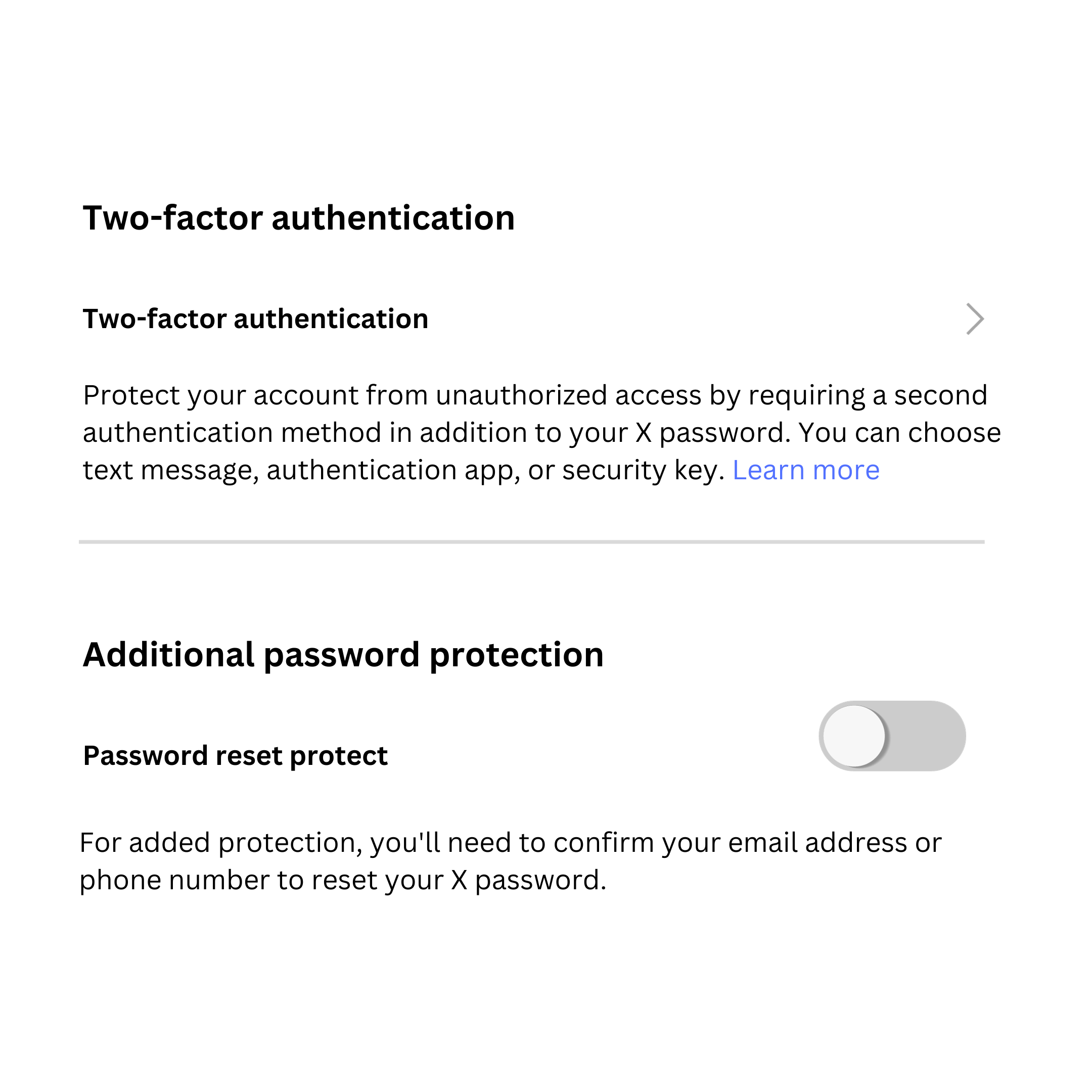 Site-ul web X sau Twitter oferă, de asemenea, o cale excelentă pentru ca utilizatorii să implementeze funcția de autentificare cu doi factori. Acesta oferă un avantaj suplimentar, deoarece permite utilizatorilor să utilizeze chei de securitate ca mod de autentificare. Folosirea browserului de pe desktop pentru această activitate permite o implementare mai rapidă și mai ușoară.